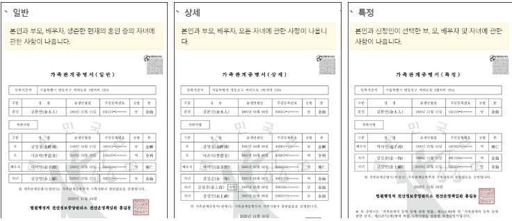 | 특정 증명서 | 본인과 신청인이 선택한 부모 또는 배우자 및 자녀에 관한 상세 내용이 기제 |