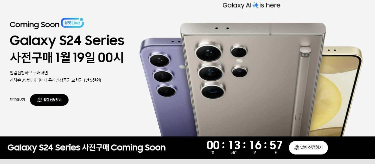 ✅ 사전예약 알림신청하기가 있습니다. 갤럭시 S24 사전예약이 시작되면 나에게 자동적으로 알림이 오게 신청하는 것인데요. 공식 홈페이지 회원 가입 후 간단한 사전 예약 알림 신청하기 버튼이 있으니 꼭 신청하시기 바랍니다.