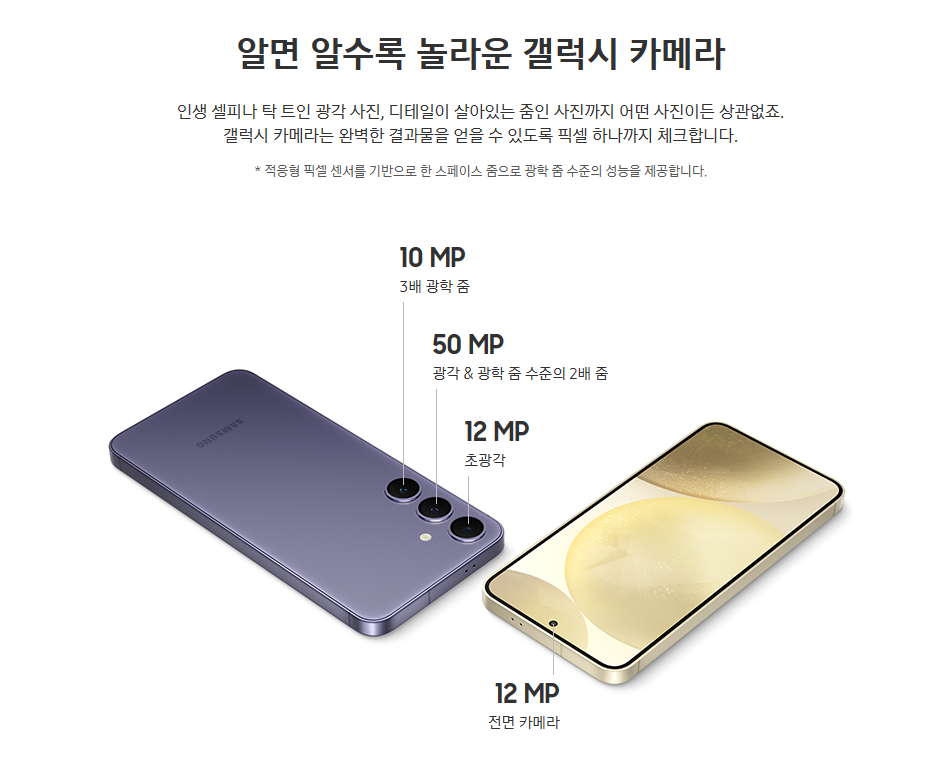 ✅ 먼저 살펴볼 S24 카메라 스팩을 살펴보면 10MP 3배 광학줌, 50MP 광각,광학 줌 수준의 2배줌, 12MP 초광각 카메라가 후반 카메라에 탑재가 되어 있습니다. 전면 카메라는 12MP 카메라가 탑재 되어 있어 어둠속 인물 샷 나이토 그래피 촬영이 가능 하고 확대할수록 선명도가 더욱더 고품질로 잡히는 최고성능의 카메라가 탑재 되었다고 합니다.