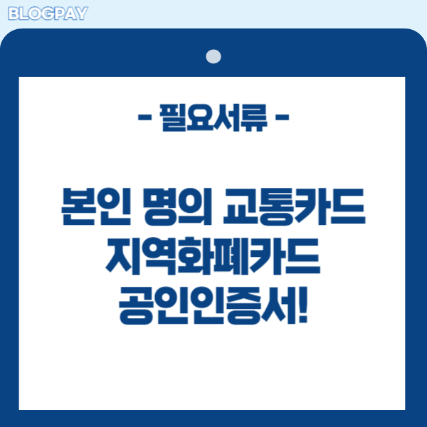 ✅ 준비서류는 3가지를 준비해야 합니다. 본인 명의의 교통카드, 본인 혹은 대리인 명의의 지역화폐 또는 계좌번호 마지막으로 본인을 인증 할 수 있는 공인인증서가 있어야 합니다. 그 외에 서류는 없으니 3가지 서류를 준비하는 일에 있어서 어렵지는 않을 것입니다.