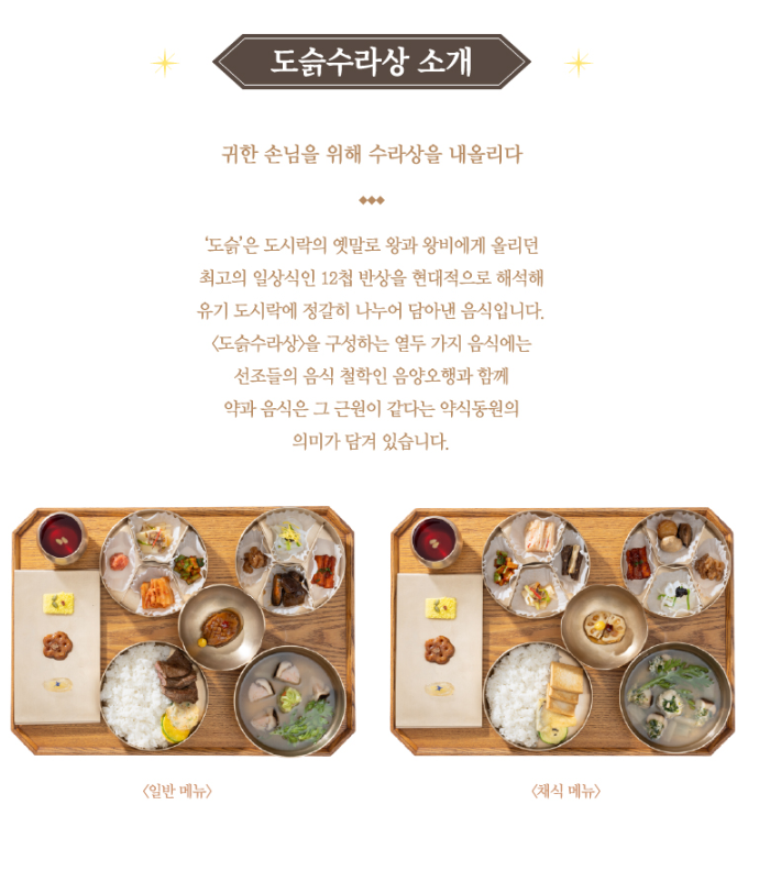 궁중음식 체험 주제가 [도슭수라상]이라는 주제로 귀한 손님을 위해 수라상을 내올린다는 뜻을 담고 있습니다. 옛 말에 왕과 왕비에게 올리던 최고의 일상식인 12첩 반상을 현재적으로 해석하여 왕들이 사용하던 유기 도시락에 정갈히 나누어 담아 방문한 여행객들에게 제제공을 한다고 합니다.