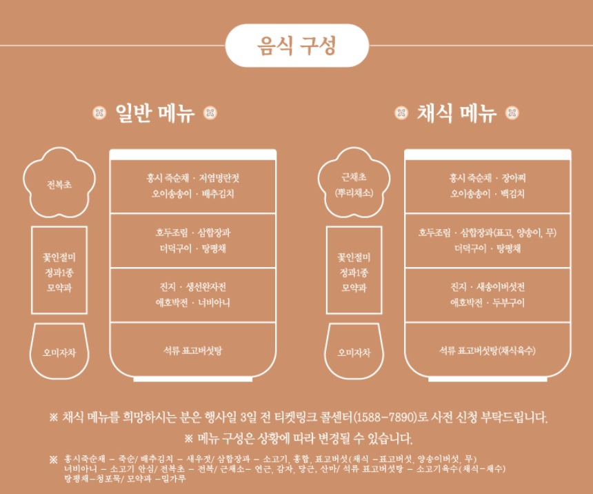 궁중 음식은 [일반메뉴 & 채식 메뉴] 2가지 중 선택 할 수 있으니 취향 것 고르시길 바랍니다. 또한 메뉴 구성은 상황에 따라서 변경 될 수 있고 채식을 희망하시는 분들은 콜센터 (1588-7890)으로 사전 신청해 주시기 바랍니다.