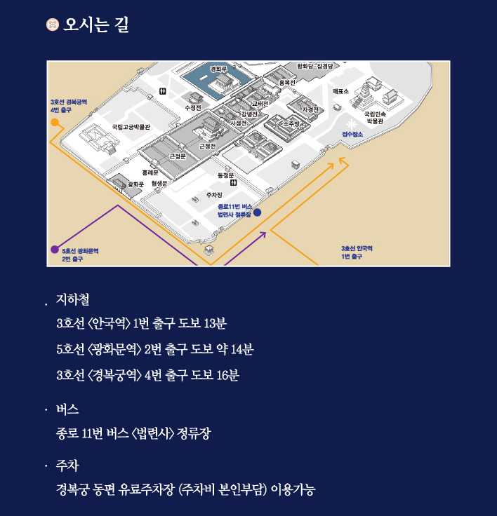 ✅ 경복궁을 방문하시는 분들은 지하철 및 버스 또는 경복궁 동편 유료 주차장에 주차하신 후 이용하시면 됩니다.