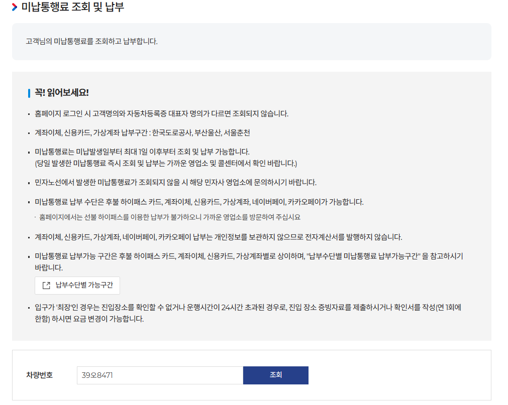 - 미납통행료는 미납발생일로부터 최대 1일 이후부터 조회 및 납부가 가능합니다.