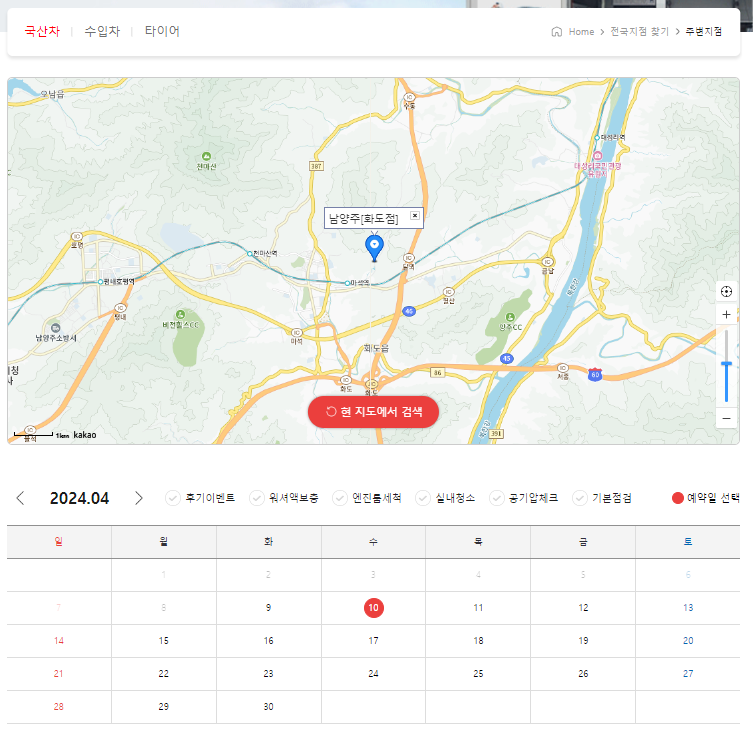 2️⃣ 국산차 또는 수입차, 타이어 3가지 서비스 중 내가 원하는 서비스를 선택하신 후 가장 가까운 위치에 있는 [공임나라 업체]를 선택 후 내가 원하는 날짜 그리고 시간대를 체크하신 후 다음을 클릭합니다.
