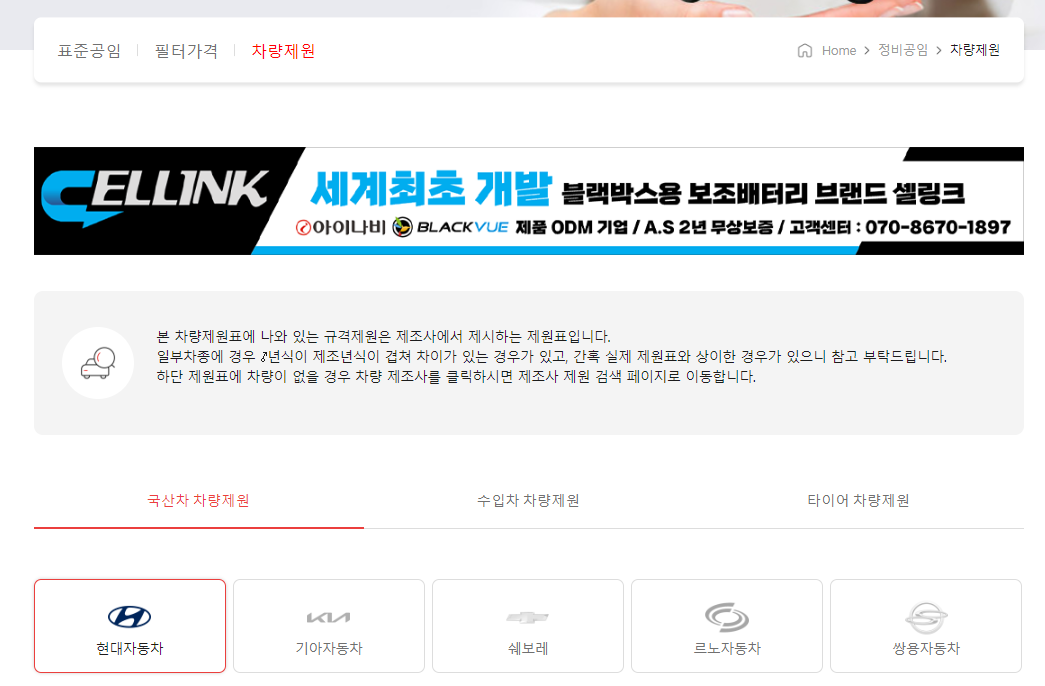 마지막으로 공임나라에서 제공하는 서비스 중 하나가 있다면 바로 [차량 제원에 대한 정보 서비스]를 제공하고 있습니다. 공임나라에서 제공하는 차량 제원 서비스는 제조사에서 제시하는 제원표를 그대로 작성해 놓았고 일부 차종의 경우 제조년식이 겹치거나 간혹 실제 제원표와 다른 모델도 있다고 하니 참고하시기 바랍니다.