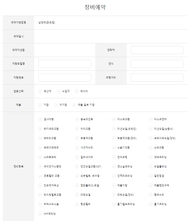 3️⃣ 운전자의 개인정보, 차량모델, 차량번호, 주행거리 내가 원하는 정비 서비스를 클릭하신 후 정비서비스에 대한 제목 및 상세 내용을 적으시면 모든 예약이 완료가 되어집니다.