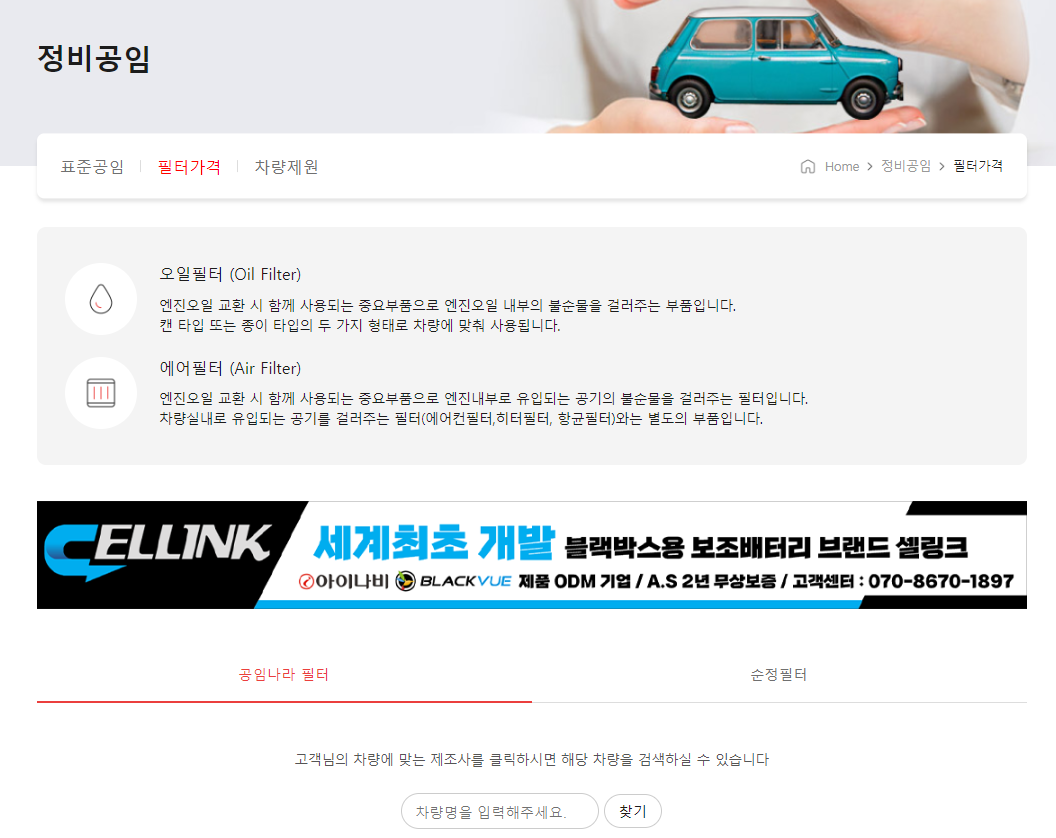 🛑 공임나라에서 파는 필터, 그리고 순정 필터 그리고 내 차량을 조회해서 내 차에 필요한 필터 가격을 한 눈에 볼 수 있도록 서비스를 제공하고 있습니다. 제조 회사에 따라서 필터 가격이 천차 만별이니 차량명 및 자동차 회사를 선택 후 필터 가격을 확인해 보시기 바랍니다.
