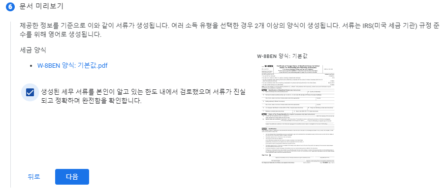 6️⃣ 문서 미리보기 부분을 보면 오른쪽 서류 이미지를 클릭하면 내가 지금까지 작성한 서류에 대한 내용을 확인 할 수 있습니다. 검토가 되었으면 서류가 진실임을 확인한다는 체크 표시에 체크를 해주신 후 다음을 클릭하시면 됩니다.