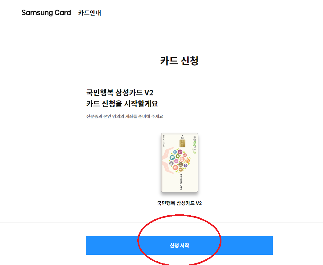 1️⃣ 첫 번째 국민행복 카드 6가지 중 내가 원하는 카드를 선택하여 카드 신청을 누르면 신청 시작을 하는 화면이 나옵니다.