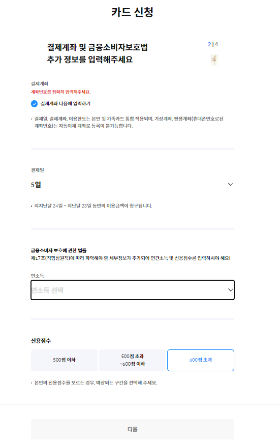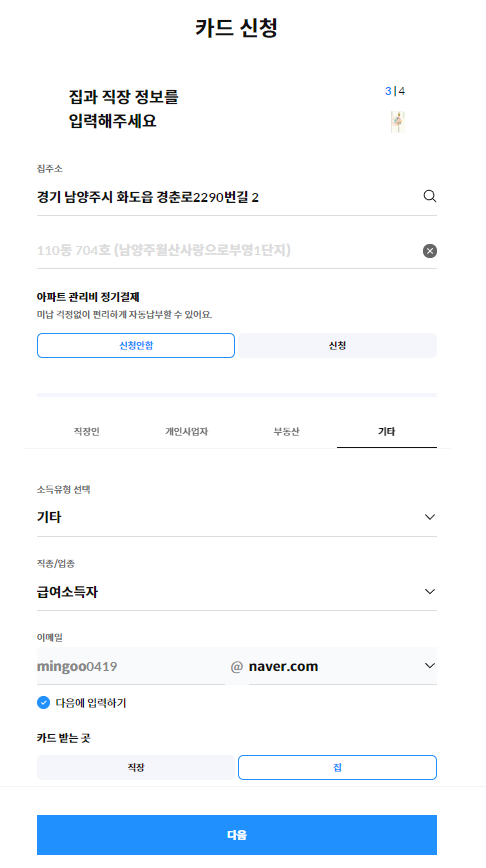 4️⃣ 결제계좌 및 소비자 보호법에 대한 정보를 기입합니다. 그리고 집과 직장 정보를 입력하시고 소득 유형 및 직업 직종 그카드 받는 곳을 선택하여 주시면됩니다.