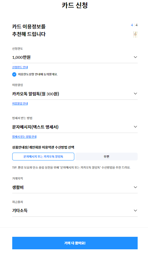 5️⃣ 마지막으로 카드 이용 정보를 작성해야 합니다. [신청한도, 이용 알림, 거래 목적 등]을 선택해 주시면 국민행복 카드 신청에 대한 모든 절차가 마쳐지고 카드 신청이 됩니다.