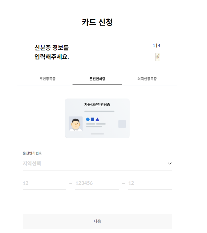 3️⃣ 카드 신청을 위해서 신분증 [주민등록증, 운전면허증, 외국인등록증]에 대한 정보를 입력하고, 본인 이름과 영문 주민등록번호 사용 통신사 및 핸드폰 번호를 기입합니다.