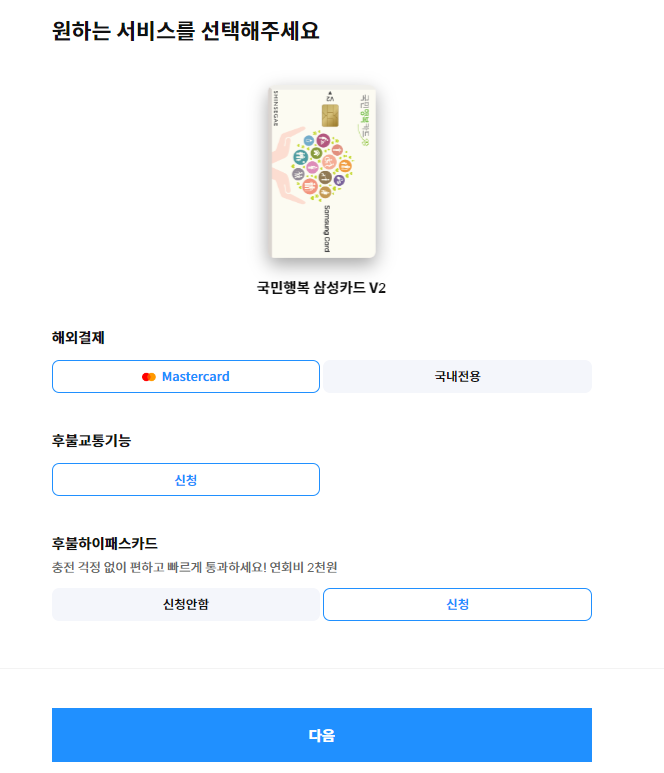 2️⃣ 카드 종류를 선택합니다. 해외에서 결제 하고자 하시는 분들은 마스터 카드를, 국내에서만 사용하시는 분들은 국내 전용을 선택합니다. 그리고 후불 교통기능, 후불 하이패스 카드 기능을 넣을지 안넣으실지 선택합니다.