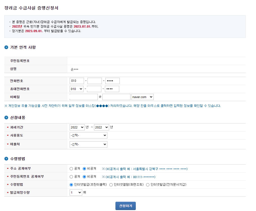 🛑 그리고 중요한 것 중 하나 수령 방법 및 주소 공개 여부 주민등록 공개 여부는 공개를 해주셔야 되요. 그리고 신청하기를 클릭하시면 출력 하실 수 있는 화면으로 넘어가게 됩니다.