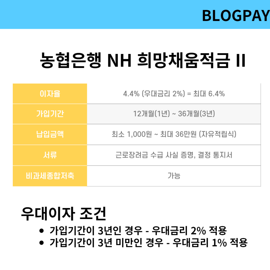 | 농협 | 36만원 | 3년 | 6.4% | 1,296만원 | 1,278,720원 |