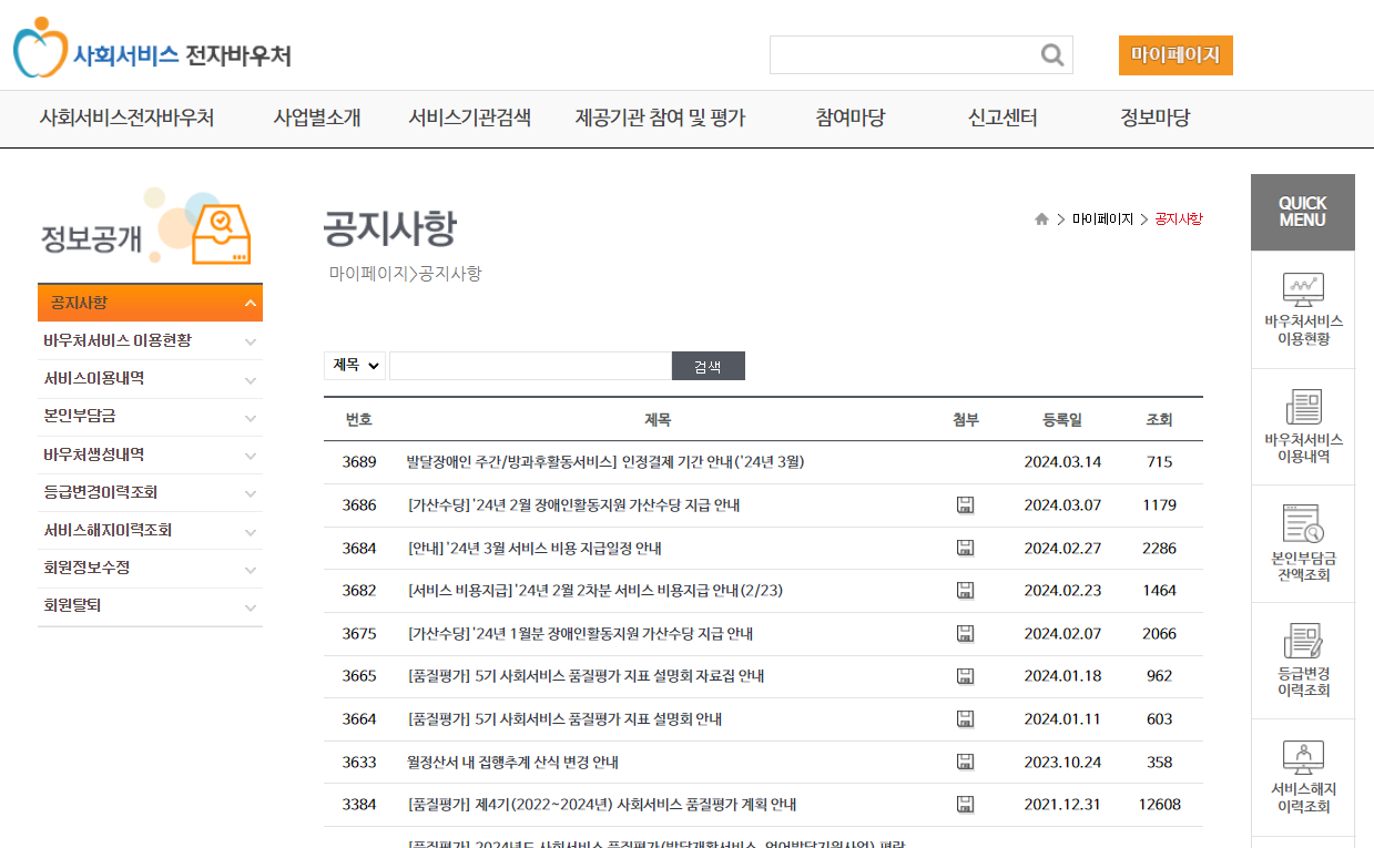 - 마이 페이지 바우처 대상자를 등록한 후 홈페이지 메인 화면 오른쪽 퀵메뉴에서 바우처 서비스 이용 현황에서 잔액 조회를 간단하게 할 수 있습니다.