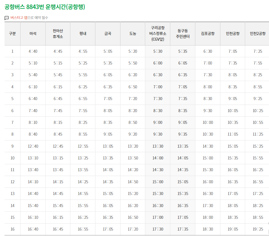 | ✅ 남양주시 마석 원병원 ⏩ 천마산 휴게소 ⏩ 평내농협 ⏩ 금곡(중앙의원 맞은편) ⏩ 도농(도농역 2번출구 파출소 앞) ⏩ 구리(롯데시네마 앞) ⏩ 구리문화원 ⏩ 김포공항 ⏩ 인천공항 1,2 터미널 |