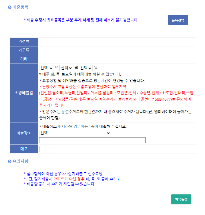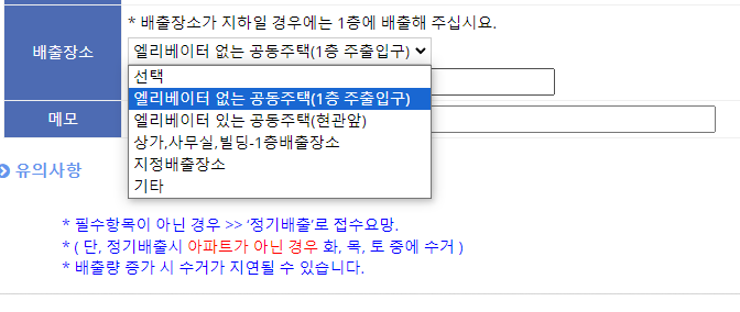 3️⃣ 배출하고자 하는 품목을 선택하신 후 배출하고자 하는 날짜를 지정하고 배출 장소가 [엘리베이터 없는 공동주택인지, 있는 주택인지, 상가, 사무실인지]를 선택하신 후 예약하기를 클릭하시면 됩니다.