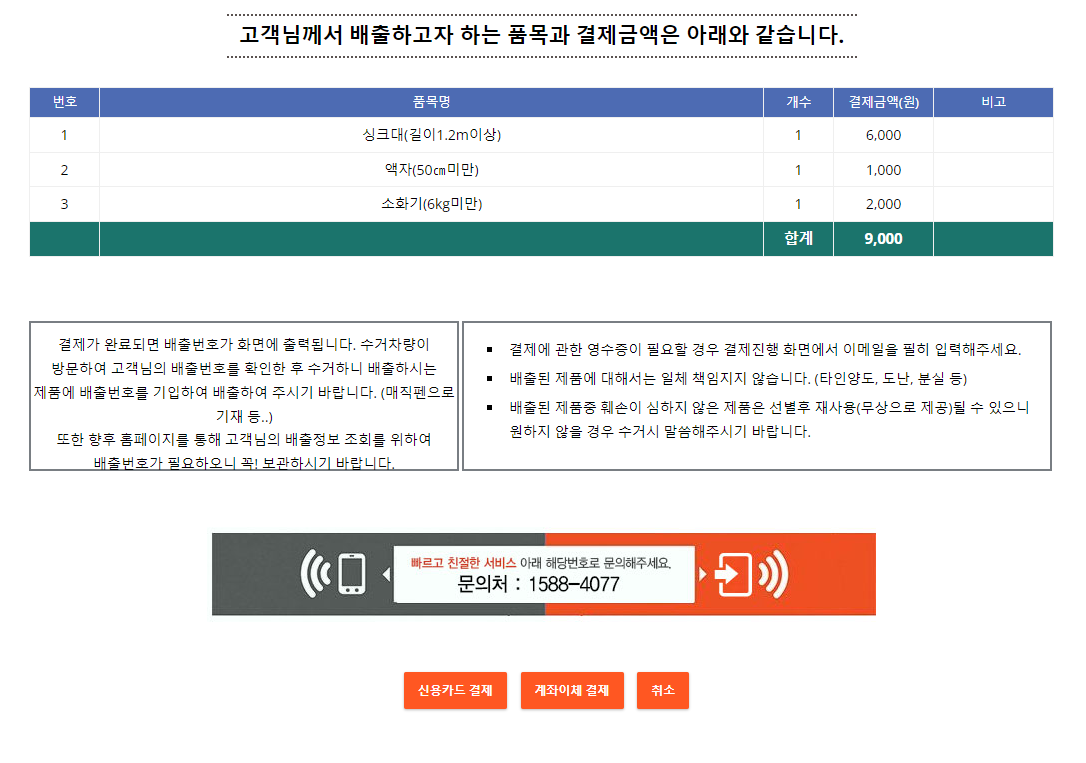 4️⃣ 마지막 내가 배출하고자 하는 품목과 결제금액을 확인하신 후 [신용카드 및 계좌이체]를 통해서 배출 금액을 결제가 완료가 되어지면 접수된 배출번호를 받게 됩니다. 그 번호를 내가 배출하고자 하는 물품에 매직펜으로 지워지지 않게 기제해 놓으시고 내놓으시면 예약된 날짜에 배출된 폐기물을 수거해 가게 됩니다.