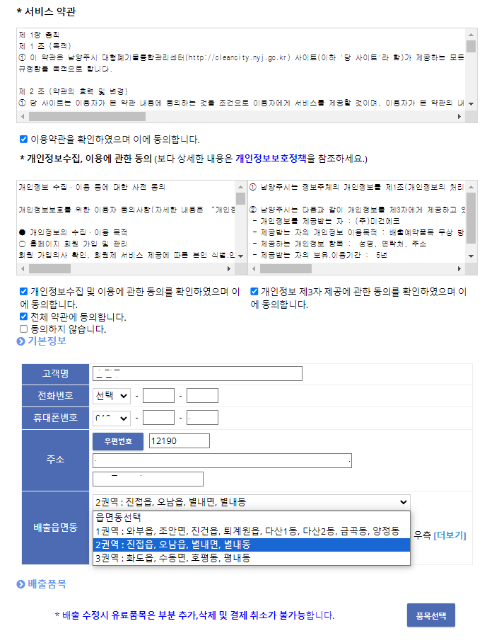 2️⃣ 개인정보 및 서비스 약관에 동의를 하신 후 배출하고자 하시는 고객의 이름과 핸드폰 번호 주소 배출읍 면동을 선택하시면됩니다.