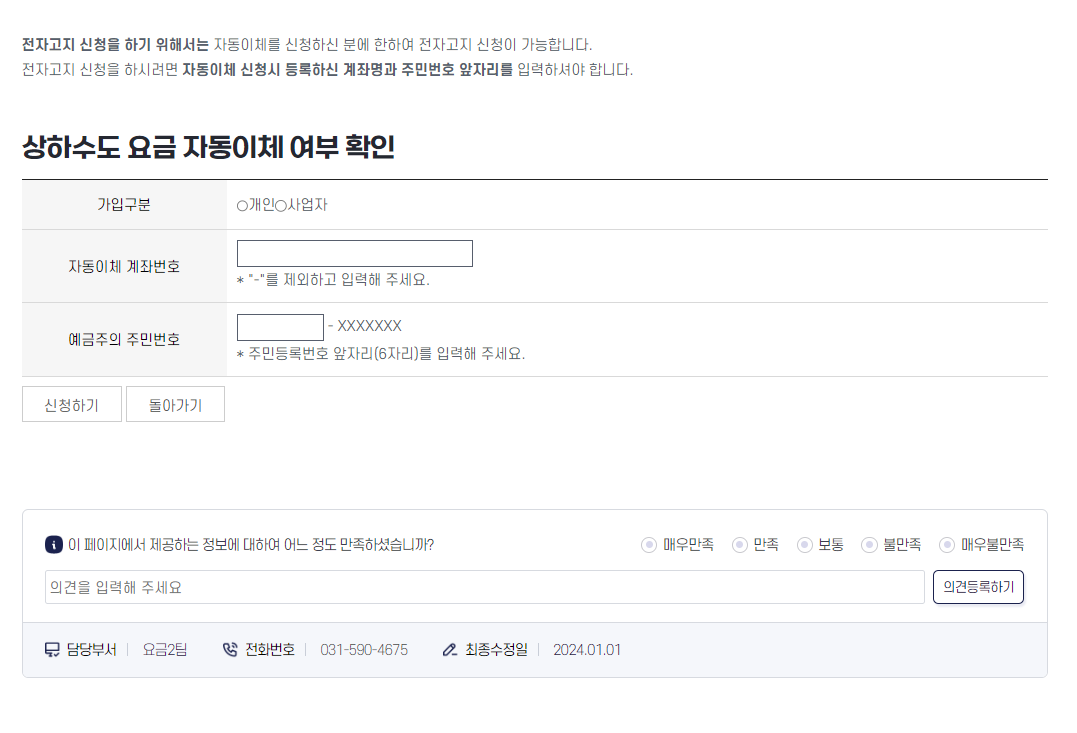 🛑 등록 화면에 [개인/사업자]를 체크 후 자동이체 계좌번호 예금주의 주민번호를 등록하시면 간단 신청이 됩니다. 신청 등록 후 7일 이후에 자동이체가 진행이 되니 꼭 검침일자, 요금 수납일자를 체크하셔서 신청하시길 바랍니다.