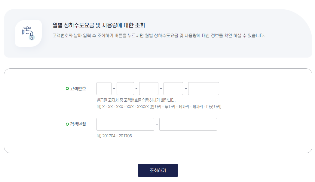 [고객번호 1-123-123-12345]로 한자리, 두자리, 세자리, 세자리, 다섯자리로 이루어진 14개의 숫자를 필요로 하고 있습니다. 이 번호만 알면 로그인 없이 간단하게 상하수도 및 여러가지 서비스를 조회 할 수 있습니다.