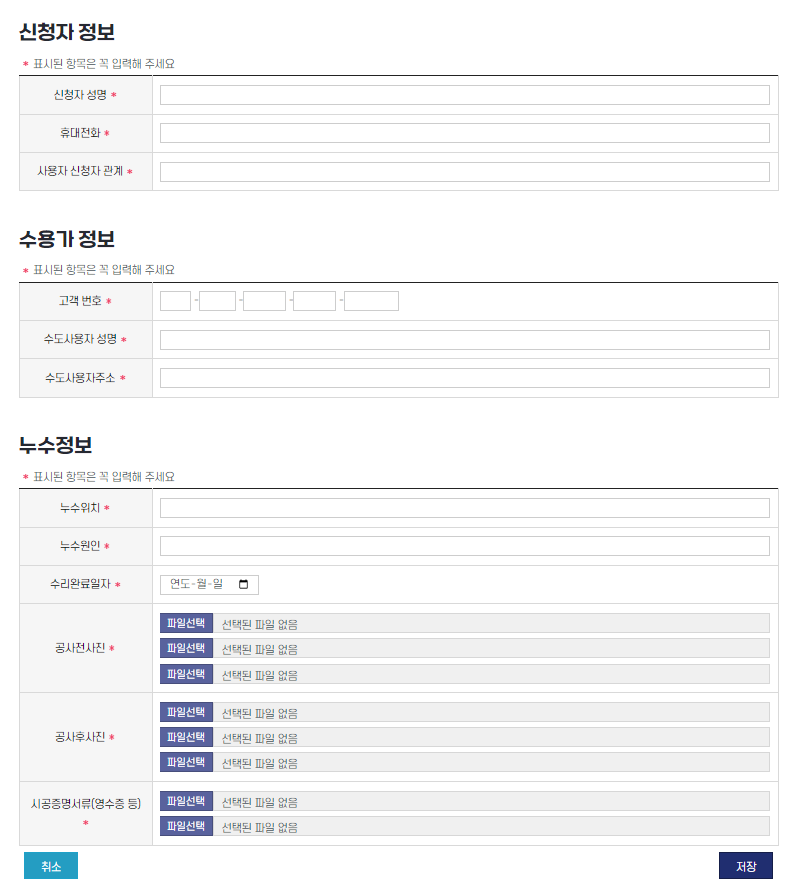 ✅ 누수로 인한 요금 부과로 인해서 감면 신청을 하는 서비스도 있습니다. 신청 화면을 들어가시면 [개인정보]를 적으시고 [수용가정보 즉 고객번호, 수도 사용자 이름과 주소]를 기입하시고 누수 위치와 누수 원인 증명 사진 그리고 수리 완료 일자를 기제하시면 부과된 수도세에 대한 감면을 진행해주는 서비스도 있습니다.