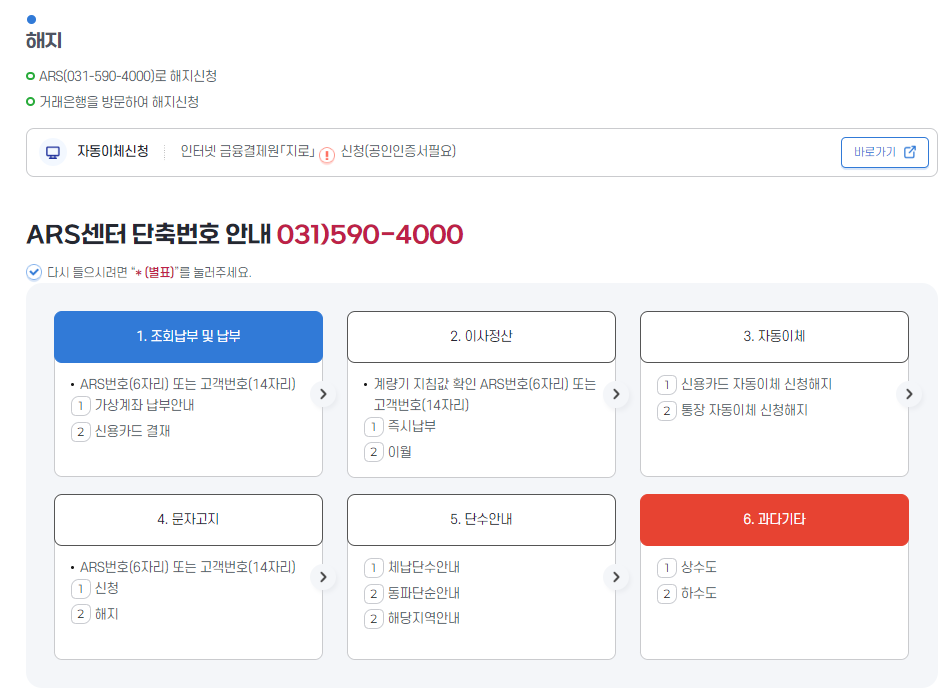 ✅ 수도세 자동이체를 하고 싶으신 분들은 [031-590-4000]번을 전화하셔서 자동납부 등록 및 해지를 진행해 주시면 됩니다. 위에 간단하게 자동납부 할 수 있는 JPG 파일 남겨드리니 보시고 그대로 진행해 보시길 바랍니다.