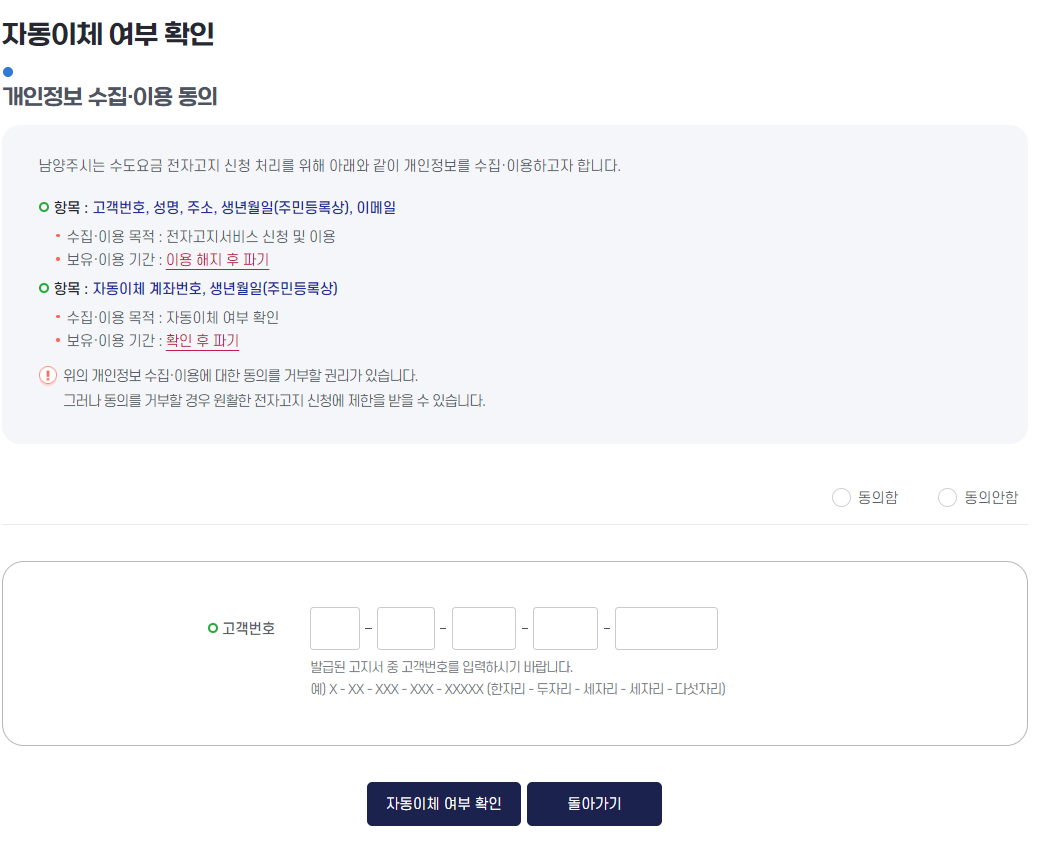 ✅ 수도요금 자동이체 여부를 확인 후 전자고지를 신청 할 수 있습니다. 고객번호를 통해서 자동이체 여부를 확인 후 계좌가 등록이 되어 있지 않는다면 등록 신청 화면이 나오게 됩니다.