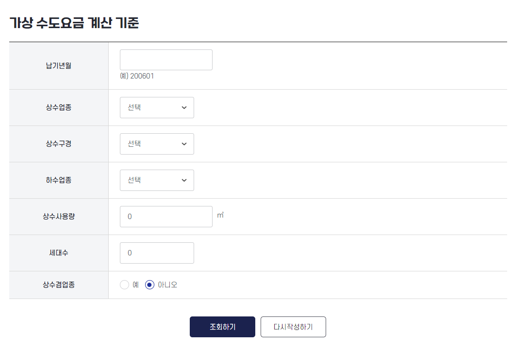 ✅ 이번달 예상 수도세가 궁금하신 분들은 가상 수도 요금 계산기를 사용하시는 방법도 있습니다. 납기년월을 적으시고 상수업종, 상수구경, 하수업종, 상수사용량, 세대수 상수겸업종에 대한 체크를 하시면 지금까지 내가 사용하고 있는 수도세에 대해서 최대한 근접한 금액으로 가상 계산을 할 수 있도록 서비스를 제공하고 있습니다.