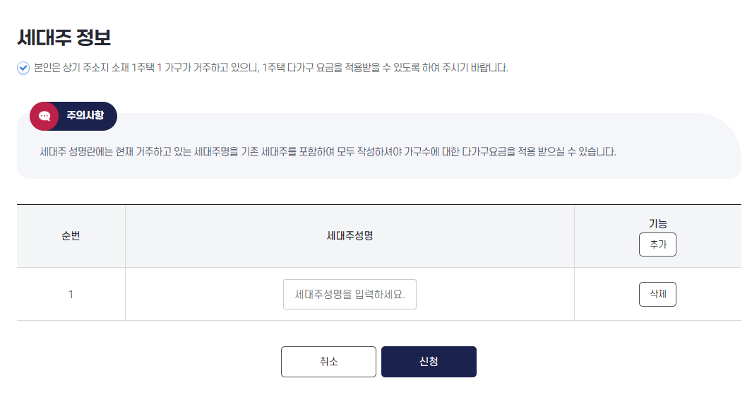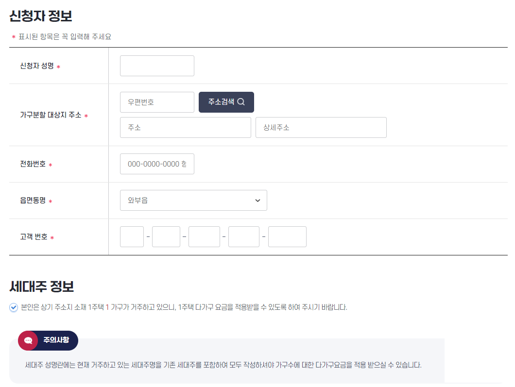 ✅ 1주택 다가구 요금을 적용 받을 수 있도록 서비스를 제공하고 있습니다. 신청자 및 가구분할을 원하는 세대주 성명을 등록하시면 간단한 신청을 할 수 있습니다.