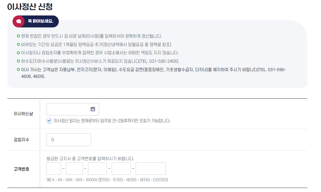 ✅ 이사 정산 이용 방법은 [이사하는 날, 이사하는 날 수도 검침 지수, 고객 번호]를 입력하고 조회하시면 간단한 이사 조회를 하실 수 있습니다.
