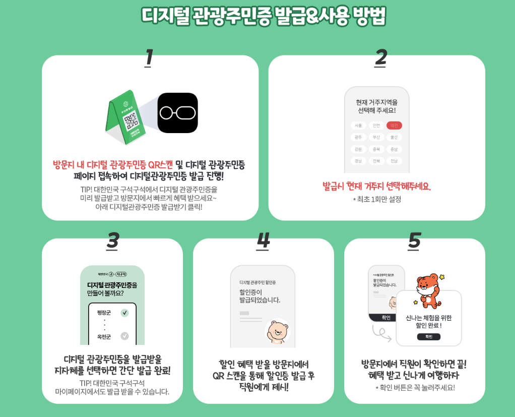 디지털 관광 주민증은 [대한민국 구석구석] 홈페이지를 통해서 간편하게 신청이 가능합니다. 신청 후 발급 받을 곳을 선택하고 직접 여행지에 도착해서 QR코드로 입장관 체엄 시설 숙박 등 할인된 금액으로 이용 할 수 있도록 서비스를 제공하고 있다고 합니다.