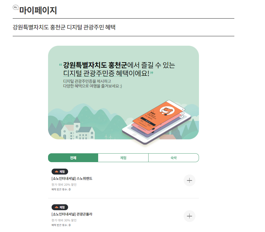 4️⃣ 제가 선택한 곳은 홍천군 디지털 관광 주민증인데요 이렇게 체험 숙박에 대한 할일을 받을 수 있는 목록들이 뜨게 되고 이 부분을 통해서 정가 할인 20~50% 이상의 할인을 받아 여행을 즐길 수 있답니다.