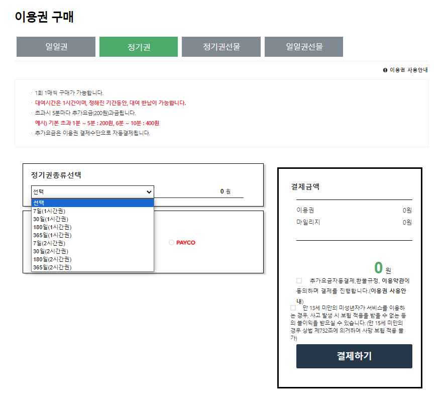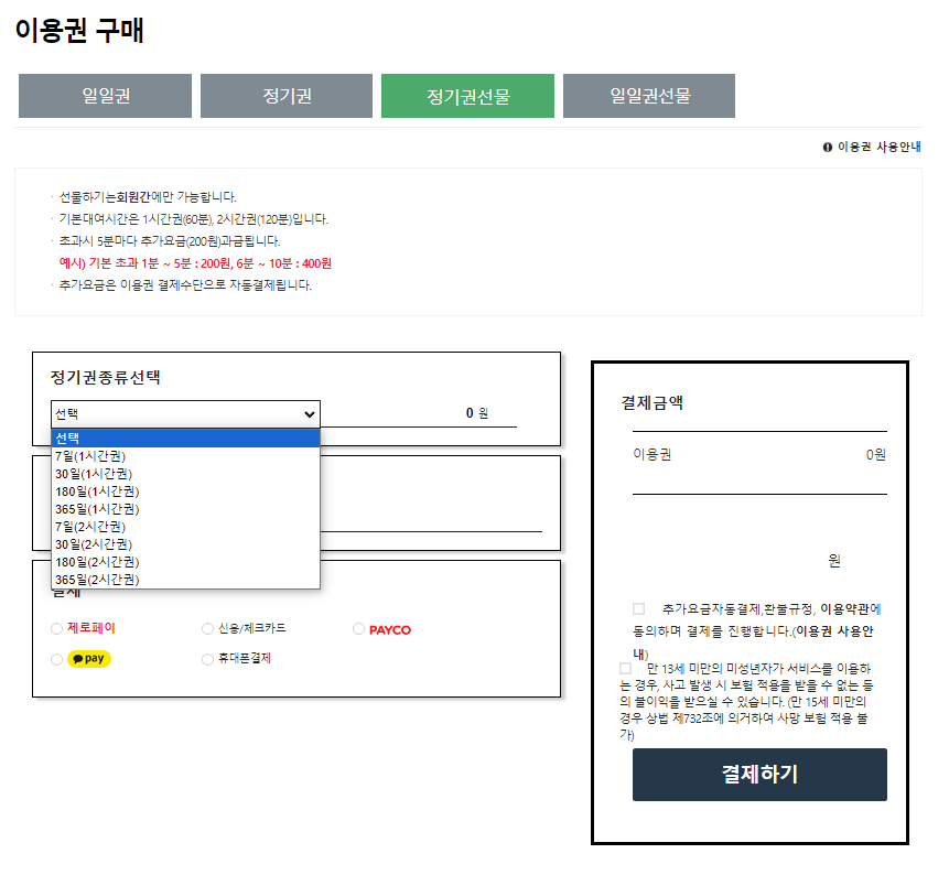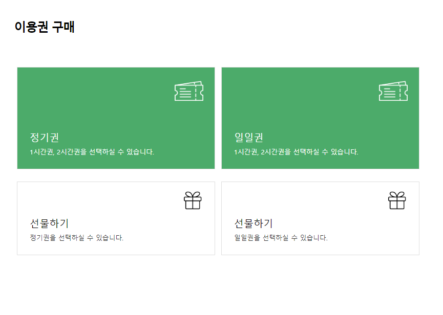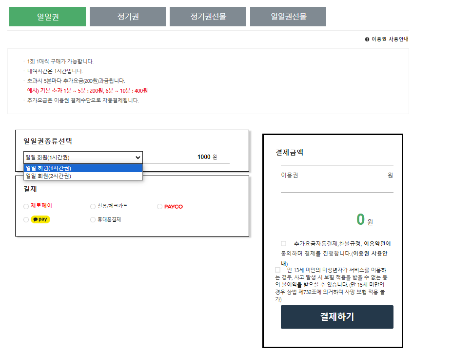 3️⃣ 일일권을 클릭하시면 종류선택이 있습니다. [1시간권, 2시간권]을 선택해주신 후 결제를 하면 모든 이용권 구입 절차가 끝납니다. 또한 정기권을 살펴보면 [7일, 30일, 180일, 365일 1시간권 2시간권]으로 구입이 가능하여 많이 애용하시는 분들이라면 정기권을 구입하시는 방법도 좋은 방법이라고 볼 수 있습니다.