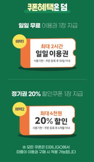 티머니고 어플을 설치 하시면 최대 2시간 일일 이용권 쿠폰이 신규 가입자에게 신규 발급 쿠폰을 지급하고 있습니다. 도한 정기권 20% 할인 쿠폰도 지급하는 이벤트를 하고 있으니 참고하셔서 혜택 받으시길 바랍니다.