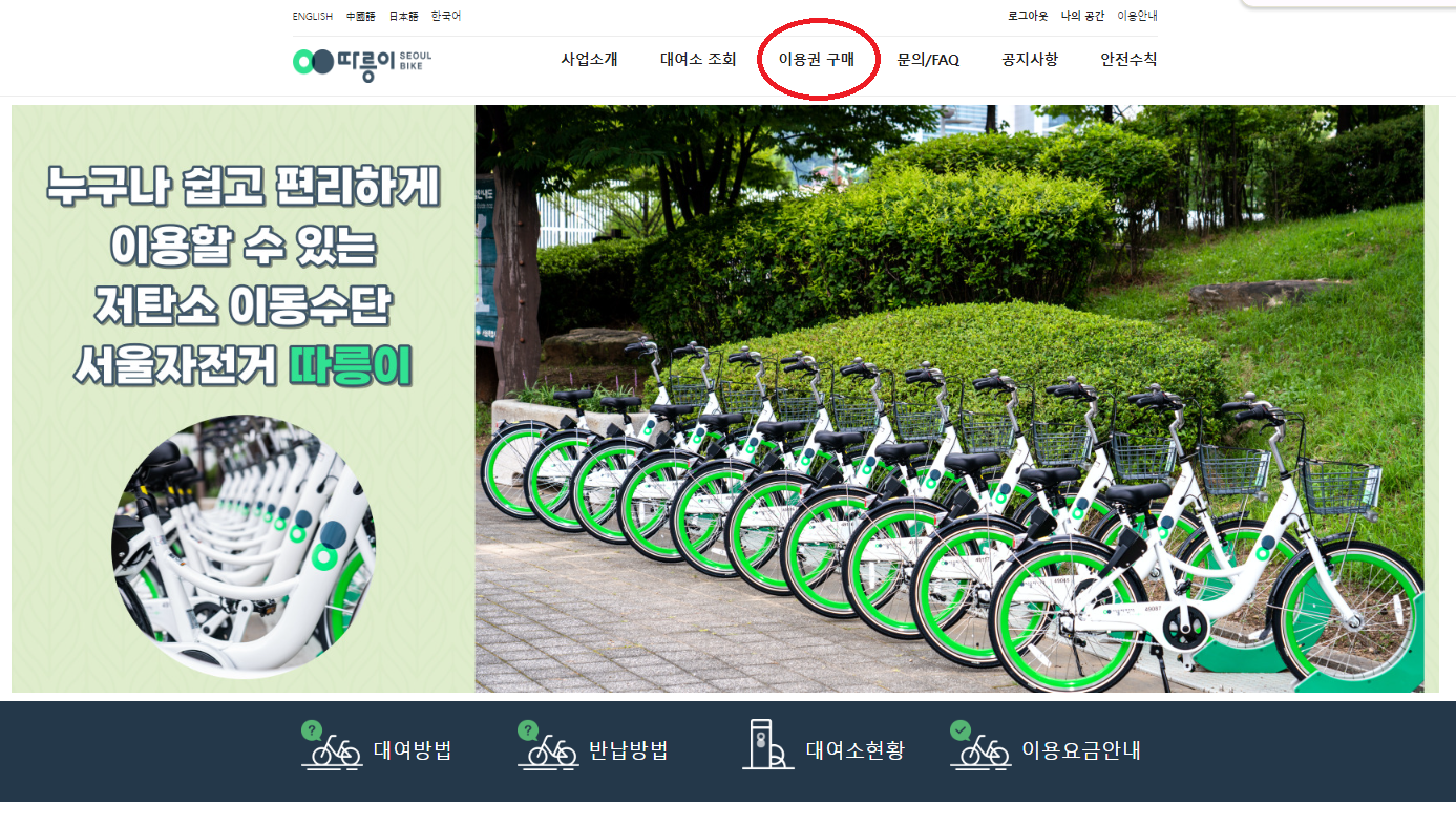 1️⃣ 따릉이 사용방법은 아주 간단합니다. 서울에서 운영하는 따릉이 공식 홈페이지에 회원 가입을 마치신 후 PC버전 및 앱 메인 화면에 이용권 구입을 클릭하시면 됩니다.