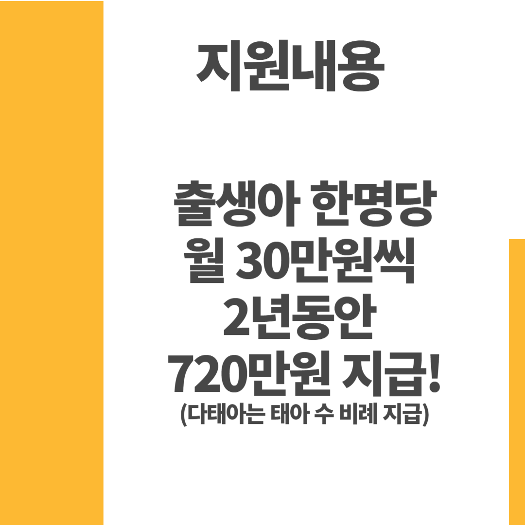 👉 지원 내용은 [출생아 한명당 2년간 월 30만원 총 720만원]이 지원이 됩니다. 만약 2명의 출생아가 있다면 월 60만원씩 총 1440만원의 지원금을 받을 수 있다는 것입니다.