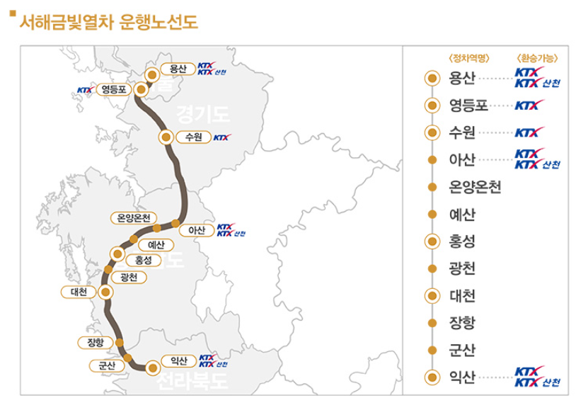 ✅ 열차는 총 12곳의 지역을 지나는 서해안 노선도로 용산에서 익산까지 총 12곳의 지역을 지나며 서해의 아름다움을 볼 수 있도록 운영이 되어지는 열차입니다. [용산 -> 영등포 -> 수원 -> 아산 -> 온양온천 -> 예산 -> 홍성 -> 광천 -> 대천 -> 장항 -> 군산 -> 익산] 으로 이루어진 열차 노선도입니다.