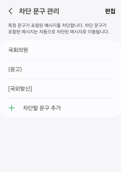 선거철과 같은 이 시즌에는 <국회의원, 시의원, 도의원, ,도지사 등> 선거에 관련된 키워드를 입력하시면 해당 단어가 포함된 문자는 자동으로 차단이 되게 됩니다.