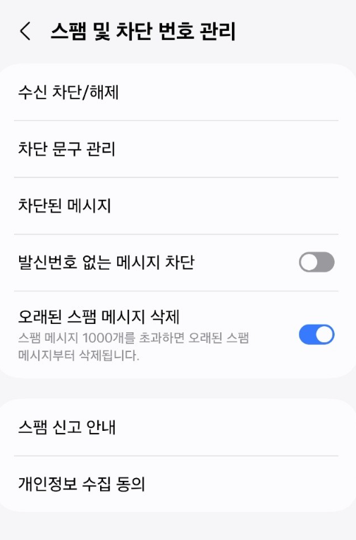 ⏫ 위에 그림처럼 문자 메시지함에 설정을 클릭하시고 <차단문구 관리>를 클릭하셔서 스팸 문자를 차단하시면 됩니다. 차단 문구 관리에는 자주 발송이 되어지는 광고 문자, 보이스피싱, 국외발신 등 스팸 문자 차단이 가능합니다.