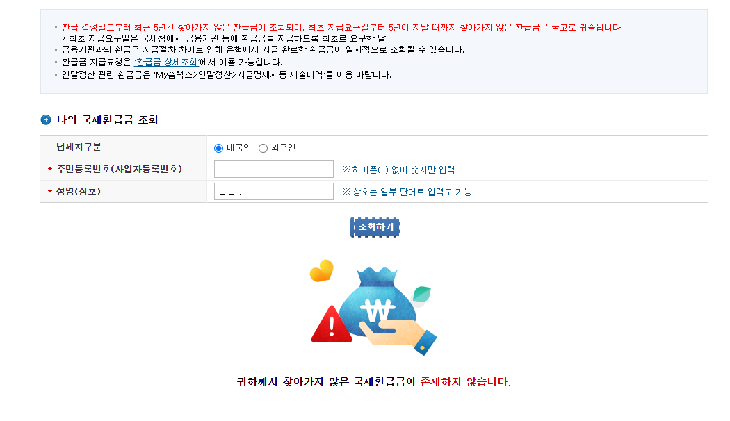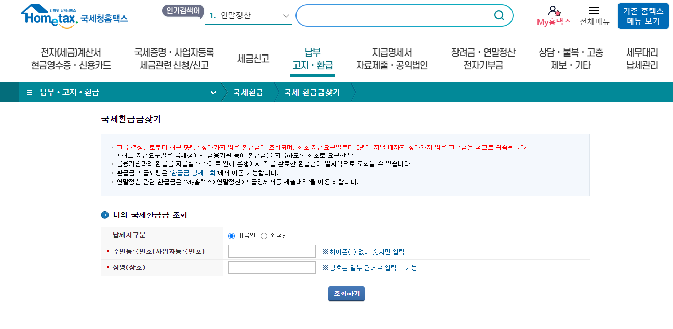 ⏩나의 국세 환급금 조회 부분에 납세자 구분 "내국인 외국인" 선택 후 주민등록번호 또는 사업자 등록번호를 기록하신 후 성명, 기업의 상호를 기재하신 후 조회하기를 누르시면 내가 받을 수 있는 환급금을 조회하실 수 있습니다.