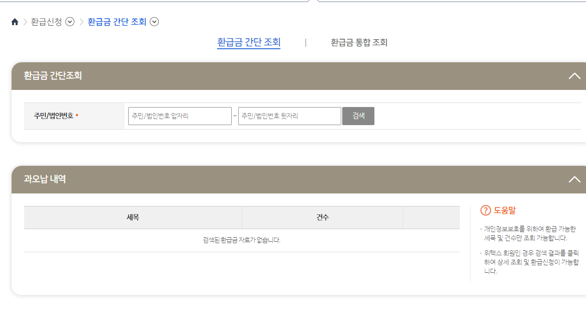 ⏩ 두 번째 환급금 조회부분에 주민등록 번호 또는 법인 번호만 적으신 후 조회 검색 하시면 내가 받아야 되는 환급금에 대해서 간단하게 조회 할 수 있는 서비스를 제공하고 있습니다. 어떻게 보면 홈택스보다 더 간편하여 위택스를 추천드리고 있습니다.