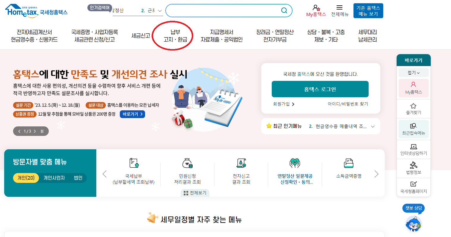 첫 번째 국세 환급금 조회 및 신청 방법은 국가에서 운영하는 홈텍스 사이트를 통해서 간단하게 국세 환급금을 조회 및 신청 하실 수 있습니다. 아래 내용을 통해서 간단하게 신청 후 내가 받아야 되는 국세 환급금을 신청 조회 하시기 바랍니다.