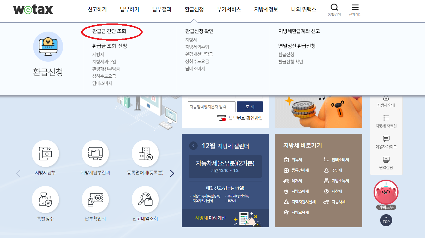두 번째로 소개해드리는 환급금 조회 서비스는 바로 자동차 조회 및 납부를 할 수 있는 위택스 홈페이지를 통해서 간단히 조회하는 방법입니다. 홈택스보다 더 간단하니 아래 내용을 참고하시면서 환급금 조회를 하시기를 바랍니다.