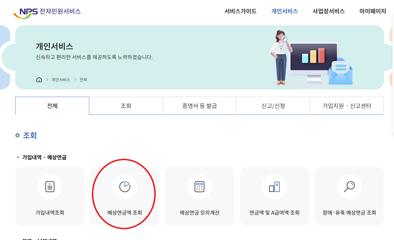 1️⃣ 연금보험 실수령액 조회를 위해서 개인 서비스 개인 정보 동의 로그인을 해주시고 조회 부분에 예상연금액 조회를 클릭하시면 다음 화면으로 넘어가게 됩니다.