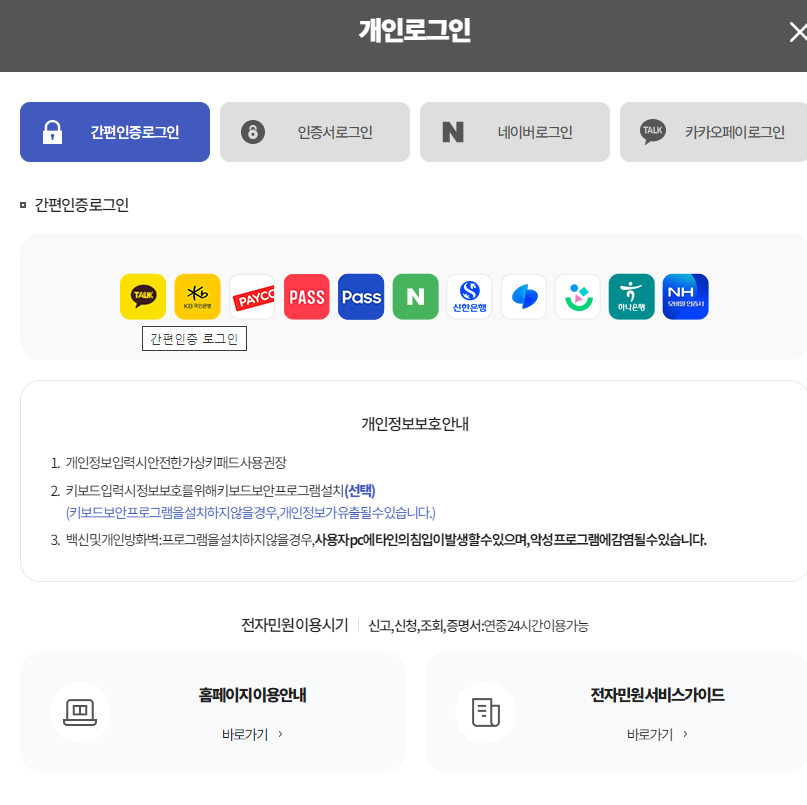 2️⃣ 조회 서비스를 이용하기에 앞서 간편 인증 로그인으로 인증하시든지, 인증서, 네이버 등등 자신이 사용하고 있는 본인 인증 서비스로 간편 인증을 하시면 국민연금공단 서비스를 이용 할 수 있습니다.