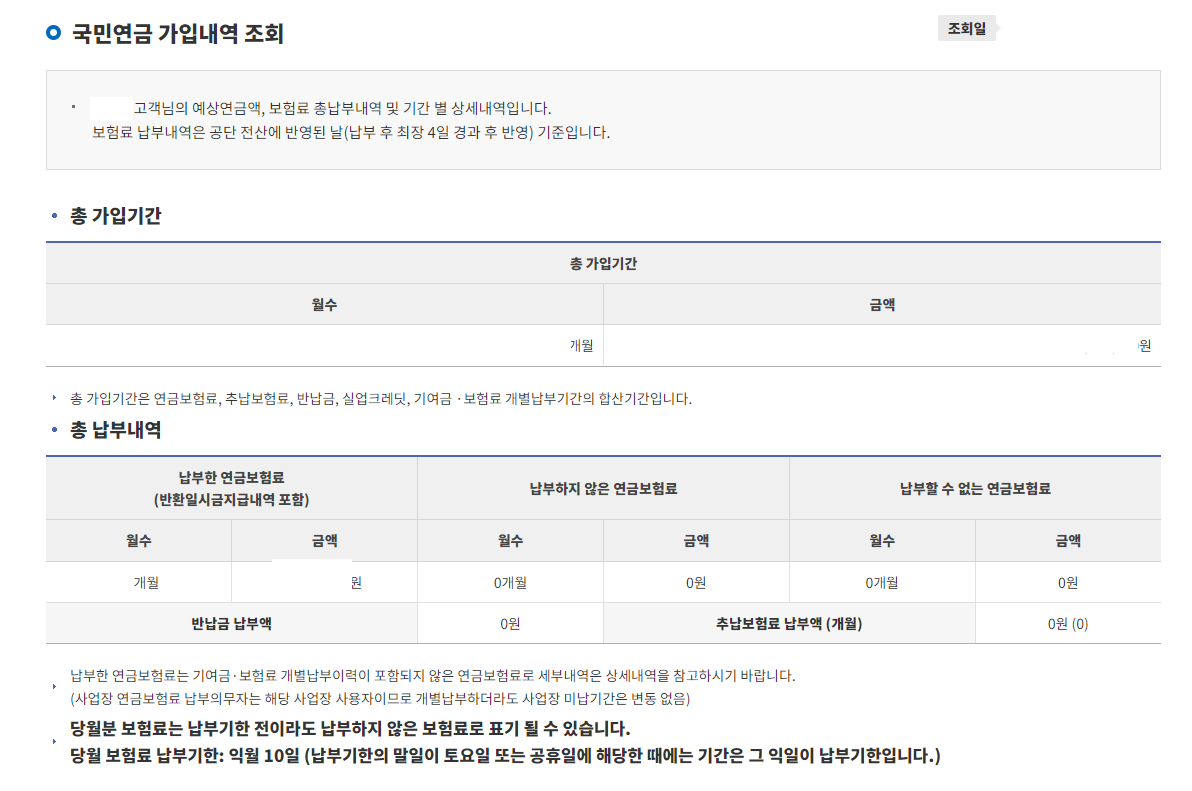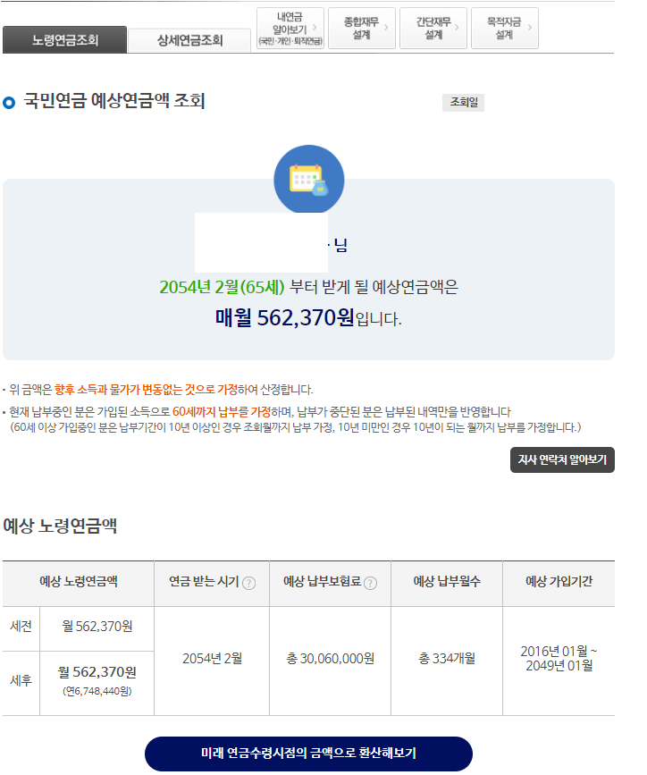 ⏩ 예상 노령 연금액을 조회해보시면 세전, 세후 연금을 받는 시기, 예상 납부 보험료(내가 내야 하는 연금 보험료) 예상 납부 월수 및 예상 가입시간 등을 간단하게 조회해보실 수 있습니다.