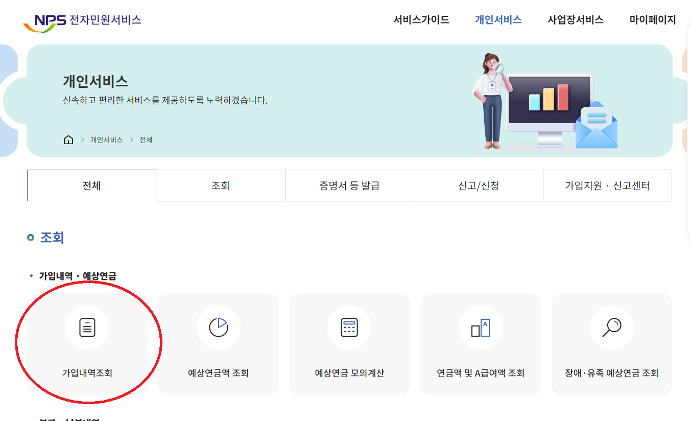 3️⃣ 로그인이 완료되면 위에와 같은 화면이 나타납니다. 개인서비스로 가입내역, 예상연금 등 다양한 서비스를 이용 할 수 있는데 가입내역 조회를 누르시면 내가 가입되어 있는 연금 서비스에 대한 정보 및 납부하고 있는 상황과 지금까지 납부한 내역들 모두 간단하게 조회가 됩니다.